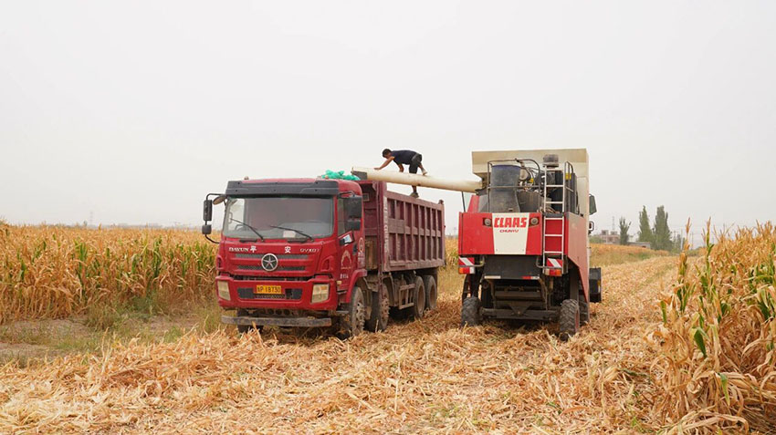 9月21日,阿扎克镇麦依村的玉米地一片金黄。收割机在田间巡航,拨禾轮将玉米秆卷入,割台将其整齐切断。机器内部轰鸣作响,玉米棒被迅速剥离,金黄的玉米粒迅速分离,源源不断地涌入旁边的运输车斗。