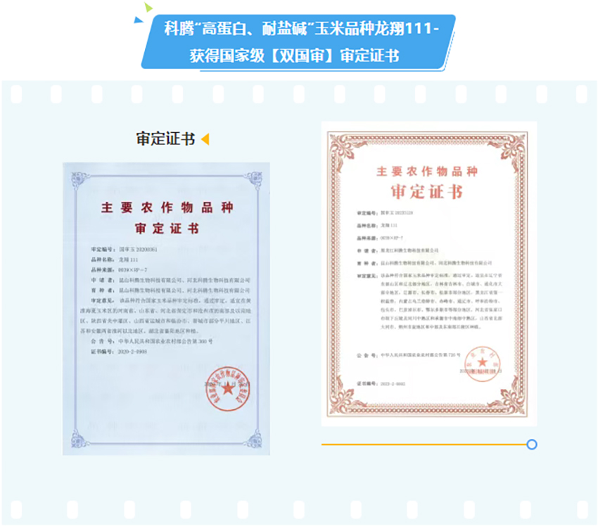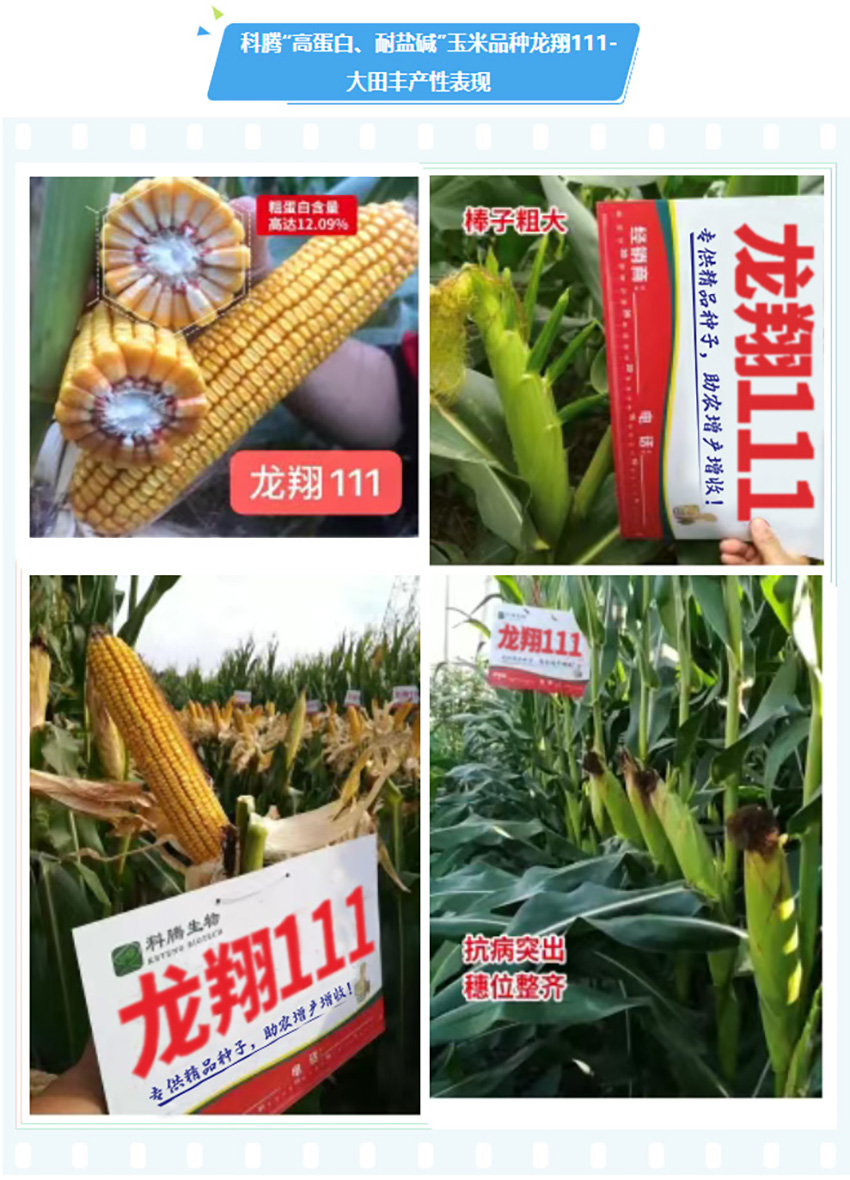 与普通玉米相比(普通玉米蛋白质含量在8%左右),科腾高蛋白玉米在营养成分上具有显著优势,科腾已经通过国家级审定的双国审玉米品种龙翔111蛋白质含量高达12.09%(已在全国范围内大面积推广应用),后续报审的新品种组合蛋白质含量更是高达14.2%,其蛋白质含量的提升意味着能够为动物和人类提供更多的优质蛋白,同时也有助于提高饲料的营养价值和转化效率。